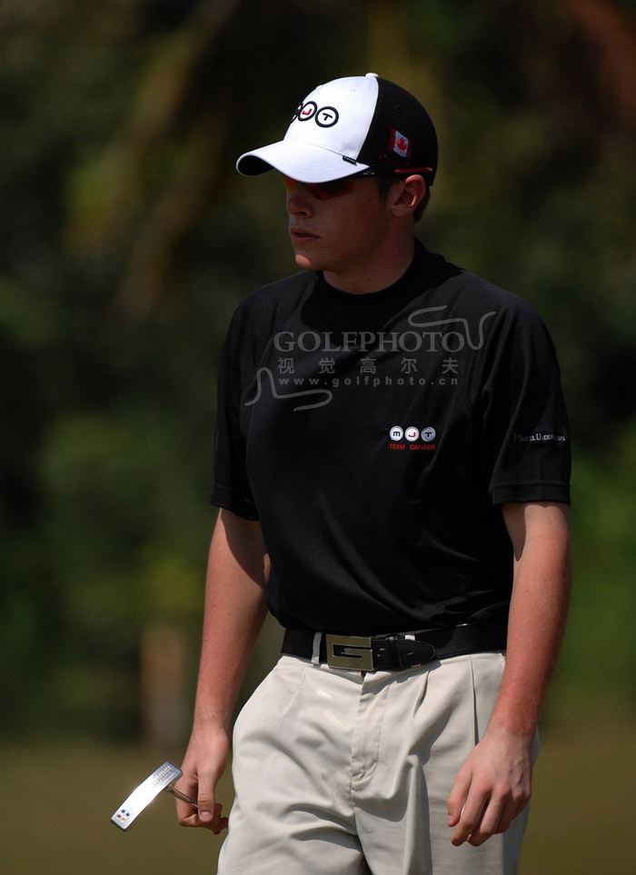 【golftime讯】2007年中国青少年高尔夫球公开赛于2月5日至9日在海南博鳌亚洲论坛高尔夫球会举办。2月7日进行了A组(15-17岁)和B组(11-14岁)男女个人比杆赛的第一轮赛事。今天早上7点,男子A组准时开球。由于浓雾笼罩球场,能见度太低,比赛暂停,直到9点30分左右比赛恢复。今天共有144名A、B组男女选手参赛,而2月6日已经结束比杆赛的C组小选手们则将在下午进行精准度的比赛。图为B组选手Evan Cowan在比赛中。