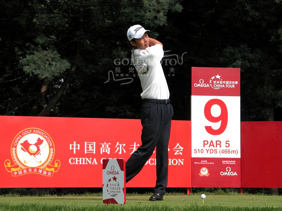 【golftime讯】欧米茄中国巡回赛昆明站9月22日在昆明乡村高尔夫俱乐部进行了第二轮的角逐。第二轮比赛,共有56名选手成功晋级,其中包括6名业余选手,国家队队员有5人成功晋级。第二轮李超以141杆-3的成绩仍排名首位。谭永宗以143杆-1的成绩排名第2。图为程军开球。