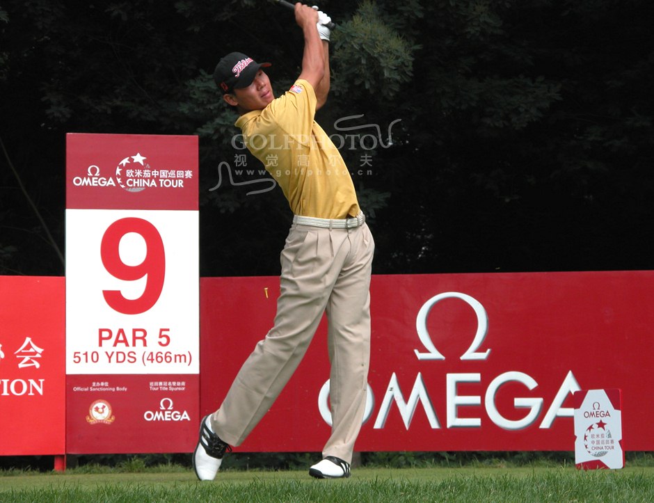 【golftime讯】欧米茄中国巡回赛昆明站9月22日在昆明乡村高尔夫俱乐部进行了第二轮的角逐。第二轮比赛,共有56名选手成功晋级,其中包括6名业余选手,国家队队员有5人成功晋级。第二轮李超以141杆-3的成绩仍排名首位。谭永宗以143杆-1的成绩排名第2。图为吴阿顺开球。