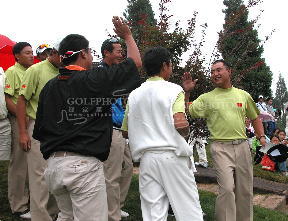 【golftime讯】欧米茄中国巡回赛昆明站9月24日在昆明乡村高尔夫俱乐部圆满落下帷幕。李超以总成绩277杆-11的绝对优势夺得冠军。黄明杰以284杆-4的总成绩获得亚军。名将张连伟以286杆-2的成绩获得季军。图为国家队队友庆祝吴康春完成比赛。