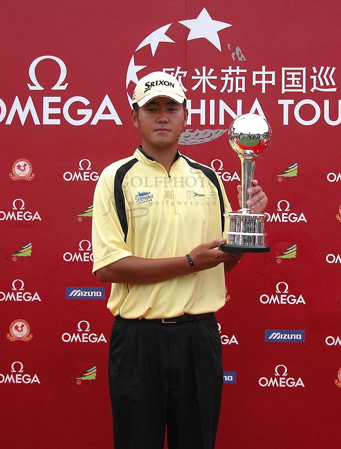 【golftime讯】欧米茄中国巡回赛昆明站9月24日在昆明乡村高尔夫俱乐部圆满落下帷幕。李超以总成绩277杆-11的绝对优势夺得冠军。黄明杰以284杆-4的总成绩获得亚军。名将张连伟以286杆-2的成绩获得季军。图为李超捧得冠军杯。