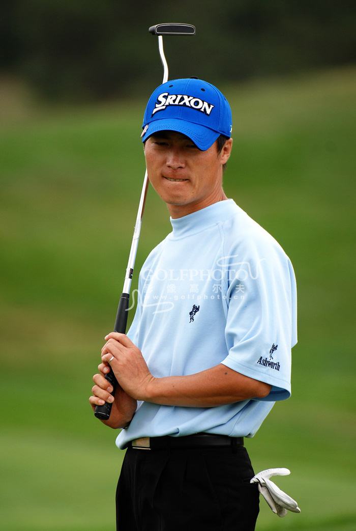 【golftime讯】2007年欧米茄中国巡回赛青岛站比赛6月1日在青岛华山国际高尔夫球会进入第2轮的角逐。今天的风非常大,果岭位置非常难,很影响选手的正常比赛。程斐两轮后152杆排名25位成功晋级。图为程斐在比赛中。
