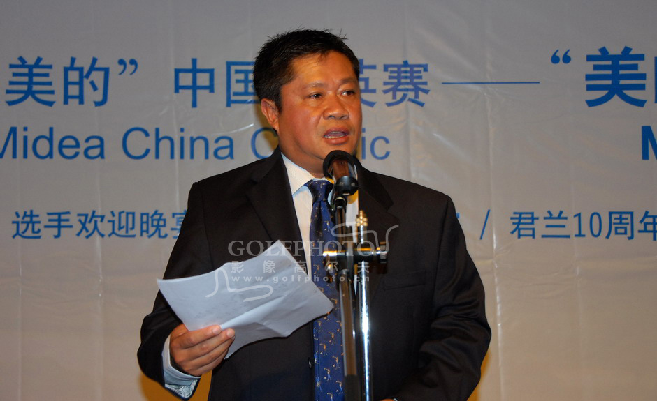 【golftime讯】“美的”中国精英赛——“美的之夜”选手欢迎晚宴、配对赛颁奖晚宴、君兰10周年庆典9月12晚日在君兰球会大宴会厅举行。中国高尔夫球协会副主席、中国职业高尔夫球员协会主席王军先生、美的集团董事局主席何享健先生、亚巡赛执行主席齐拉汉先生、国家体育总局小球运动管理中心副主任崔志强先生出席。出席当晚活动的还有配对赛嘉、赞助商代表、各国参赛选手等300多人。亚巡赛执行主席齐拉汉先生向美的集团董事局主席何享健先生颁发了倾力支持奖并佩戴亚巡赛徽章,亚巡赛执行主席齐拉汉先生向中国高尔夫球协会副主席、中国职业高尔夫球员协会主席、中信朝向高尔夫管理有限公司董事长王军先生颁发了“亚巡赛名誉主席”匾牌和佩戴亚巡赛徽章。配对赛的各个奖项也相继颁出。席间的魔术和变脸表演精彩纷呈。人们频频举杯,预祝赛事取得圆满成功。
