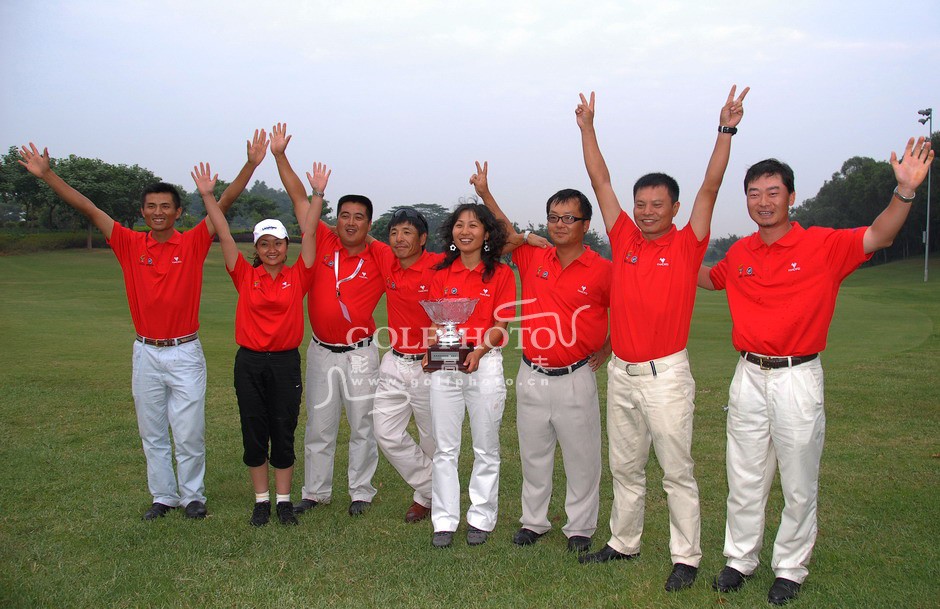 图为昆明滇池湖畔高尔夫俱乐部队带着欢笑捧冠军杯。