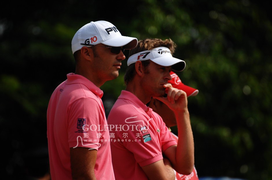 【golftime讯】2007年欧米茄观澜湖高尔夫世界杯于11月23日在观澜湖奥拉沙宝球场进入第二轮的比赛,今天进行的是四人二球赛。首轮打出64杆排名并列第9的法国队,今天打出71杆,两轮后以135杆-9的成绩排在并列第10位。 四人二球赛即二人对抗二人,每一方各打一个球的比赛。球手轮流击球,直至球入洞为止。球手必须轮流发球:一球手在奇数发球台发球,另一球手在偶数球台发球。杆数最低者为该洞的胜方。 图为法国队在次轮比赛中。(报道:golftime·君玲/摄影:golfphoto·老高)