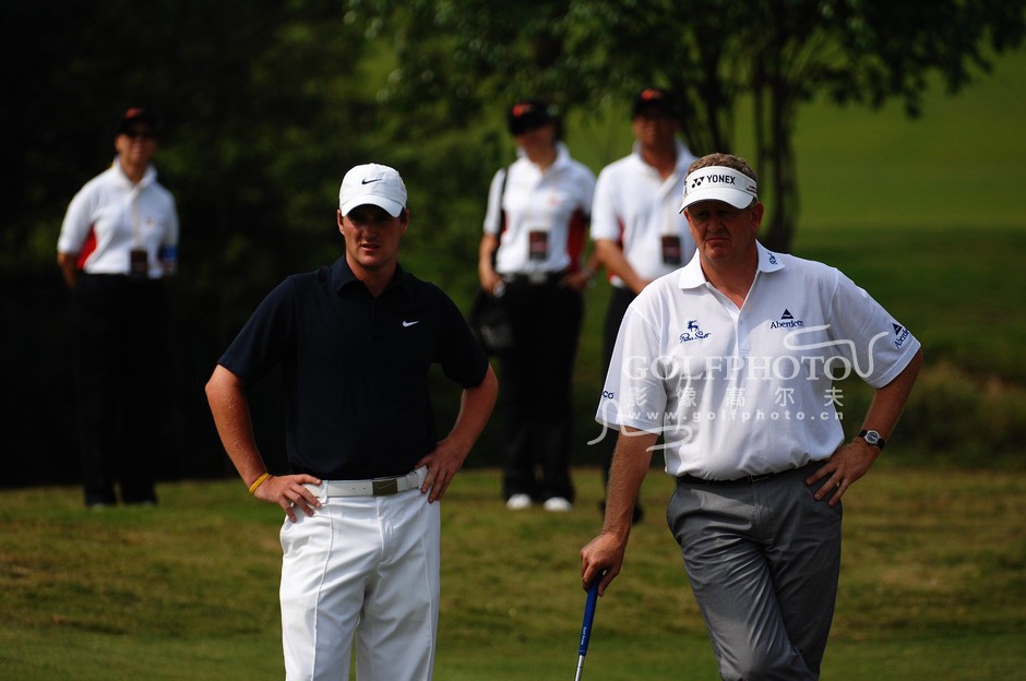 【golftime讯】2007年欧米茄观澜湖高尔夫世界杯于11月23日在观澜湖奥拉沙宝球场进入第二轮的比赛,今天进行的是四人二球赛。首轮打出63杆排并列第3的苏格兰队,第二轮的成绩为68杆,两轮后以131杆-13的成绩排在并列第2位。 四人二球赛即二人对抗二人,每一方各打一个球的比赛。球手轮流击球,直至球入洞为止。球手必须轮流发球:一球手在奇数发球台发球,另一球手在偶数球台发球。杆数最低者为该洞的胜方。 图为苏格兰队在次轮比赛中。(报道:golftime·君玲/摄影:golfphoto·老高)